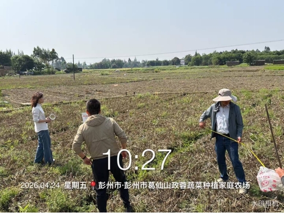 调研期间,郑晓斌前往彭州市葛仙山政蓉蔬菜种植家庭农场,实地调研当地蒜苔种植产业。调研发现,蒜苔种植面临多重病虫害挑战:蒜苔花上葱蓟马发生严重,蒜根处根蛆、韭蛆、根螨等害虫危害突出,对蒜苔产量与品质造成较大影响。郑晓斌现场观察病虫害发生规律,与农场种植户、技术人员沟通防治难点,为后续开展生态防控技术研究、绿色植保方案制定收集一手资料。