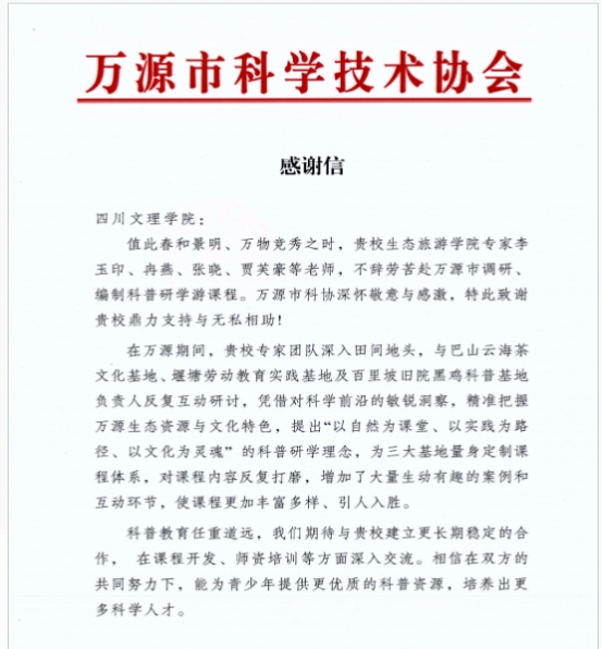 校地携手赋能科普研学 学院获万源市科协专函感谢